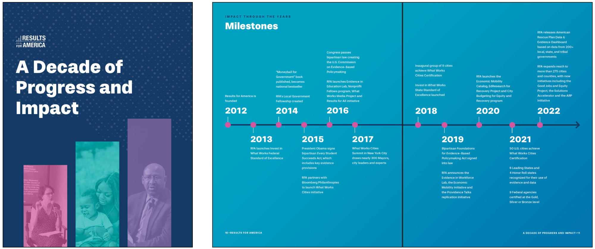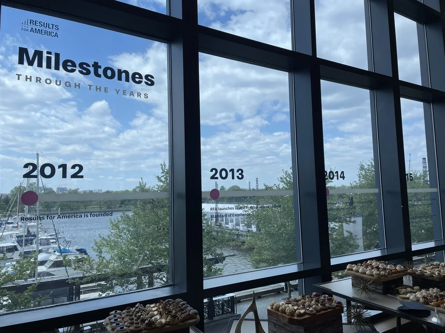 In 2022, in celebration of Result for America’s 10th anniversary, Buoy designed an interactive website and accompanying print report. We also created the event space’s window graphics and the deck for the full run-of-show.