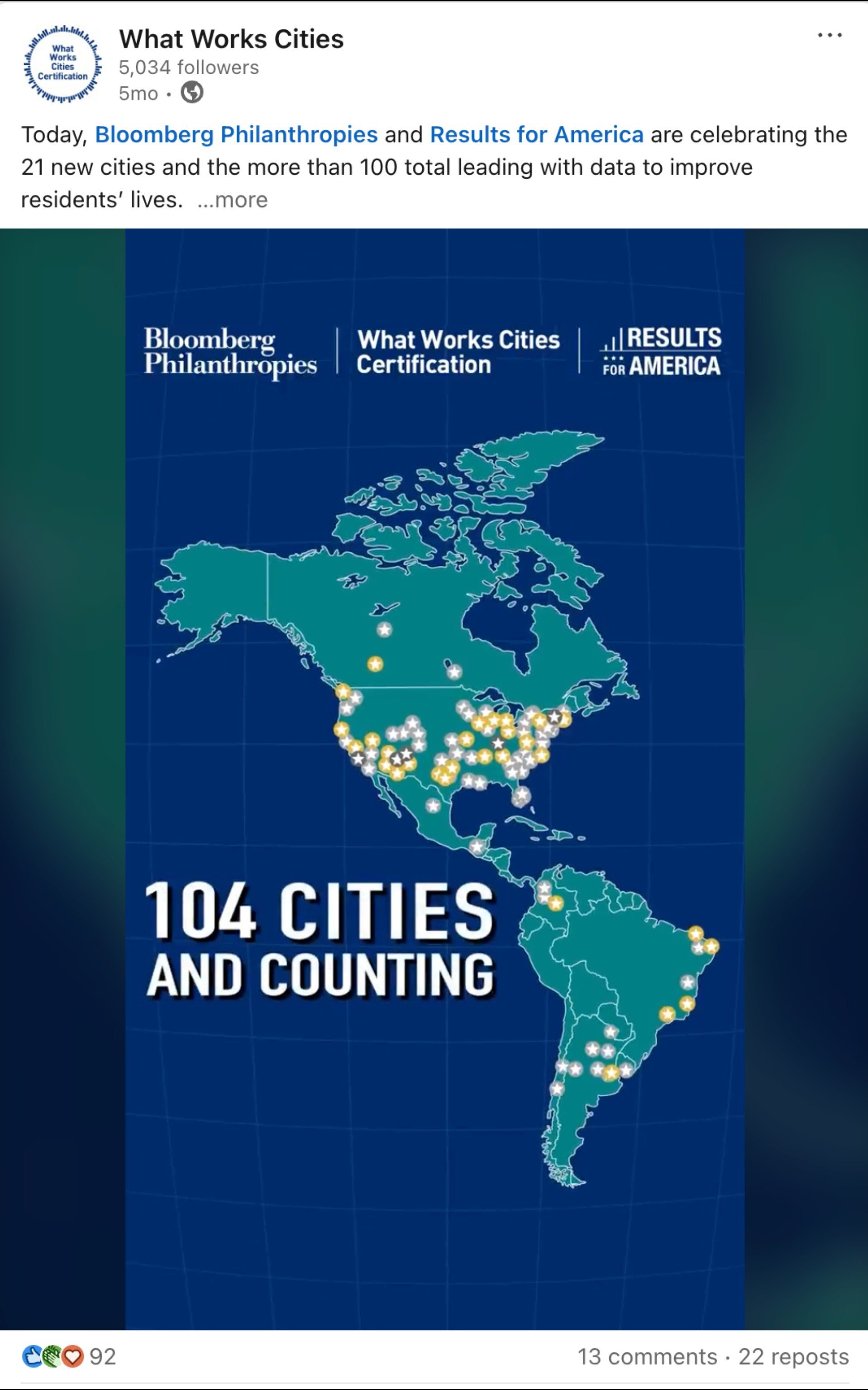 Since the organization launched, brand recognition has grown significantly — today, over 100 cities in the United States, Canada, and Latin America have achieved What Works Cities Certification.